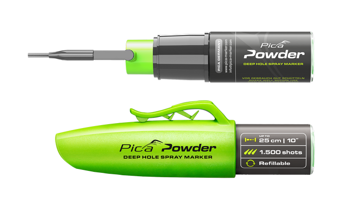 Маркер в спрее Pica Powder обеспечивает точную и быструю маркировку через отверстия глубиной до 250 мм. Струёй распыления он оставляет зеленую флуоресцентную меловую маркировку.