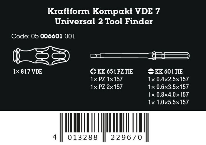 1 ручка-держатель 817 VDE Kraftform и 6 сменных отвёрток VDE с идентификатором инструментов Take it easy: цветовая кодировка и лазерная гравировка размера. Инструменты проверены поштучно по стандарту IEC 60900. Поштучная проверка под напряжением 10000 В для безопасной работы на оборудовании с допустимым напряжением 1000 В. В добротной поясной сумке. Мягкая сумка имеет с обратной стороны зону на липучках. Используя прилагаемые полоски-липучки, такую сумку можно крепить к компонентам системы Wera 2go. А можно к стене, полке и инструментальной тележке.